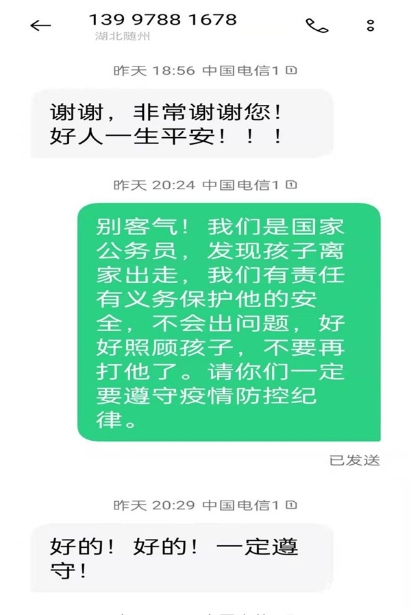 4月4日凌晨6点多,下沉党员干部姜彬在社区卡点值守过程中,发现一名初中生模样的男孩穿着短袖孤身一人在街上行走。他立即上前询问,但该男孩情绪不稳定且拒绝沟通,坚持说自己出来是跑步锻炼身体。在对其进行耐心、细致劝导后,男孩终于道出了实情。原来他家住曾都区汉东星都小区,疫情期间在家上网课时因与家人闹矛盾,心情不好,就偷偷离家出走,也没带手机。得知此情况后,姜彬立即联系其父母,考虑到交通管制且孩子衣着单薄,又马上联系区税务局司机聂师傅和其一道将孩子送回其所住小区。