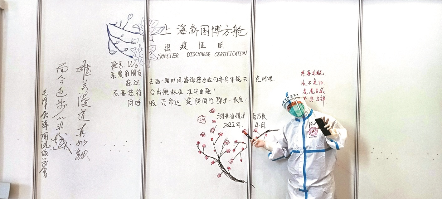 “感谢您和我们并肩作战,共克时艰,恭喜您符合出舱标准,准许出舱!”4月11日,陈沁和同事们在空白墙上绘制了一幅醒目的“退疫证明”,患者出院前可以到这里留影纪念。“希望这些手绘作品不仅可以鼓励患者,也能让我们医护人员缓解压力。”