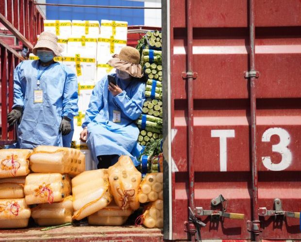 4月22日,在山东兰陵县公益性农产品批发市场,搬运工人将生姜装上货车。