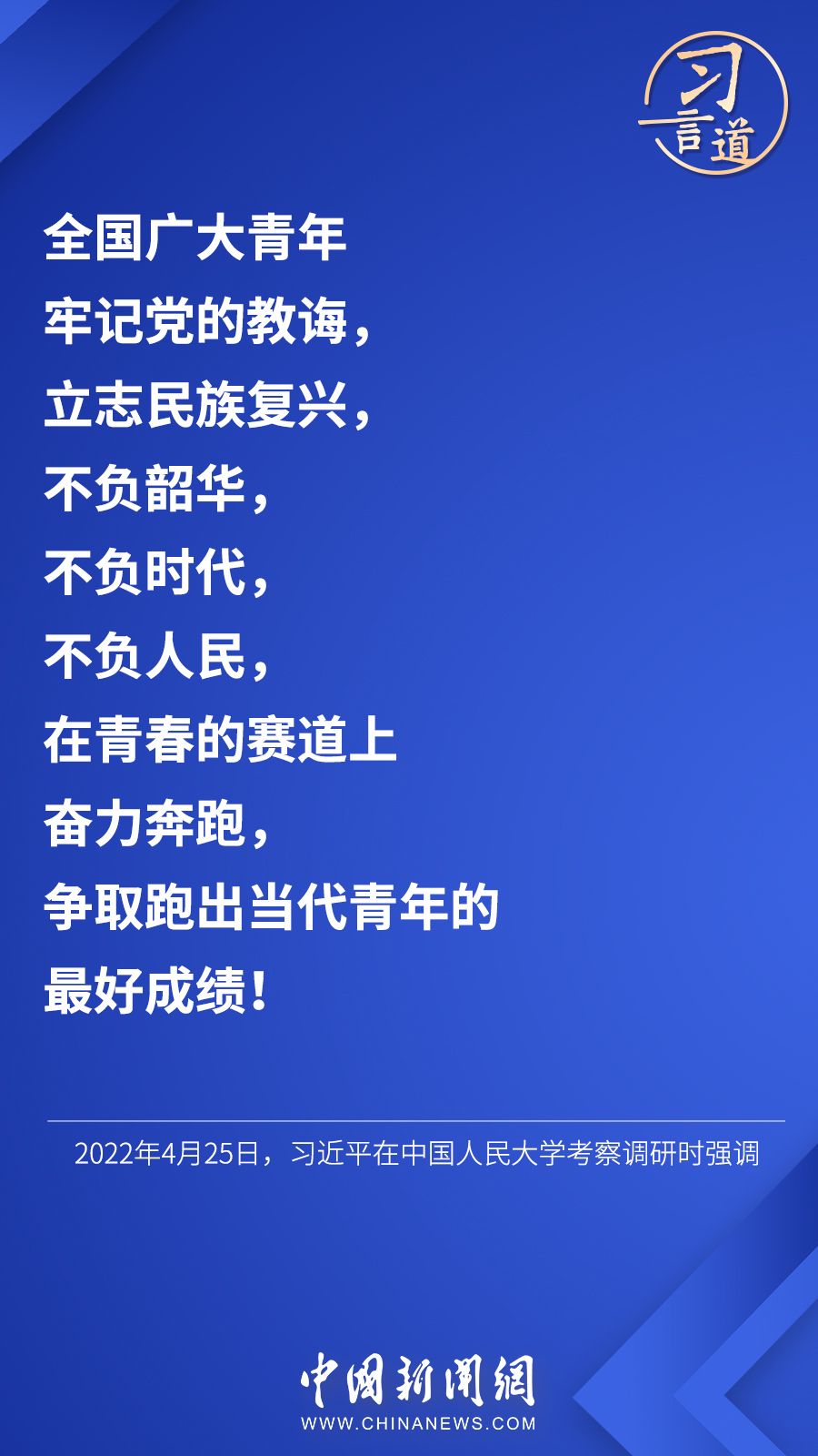 在五四青年节前夕,习近平总书记4月25日来到中国人民大学考察调研时勉励广大青年,在青春的赛道上奋力奔跑,争取跑出当代青年的最好成绩!总书记一直特别关心大学生们的学习和成长,曾多次走到大学生中间,同他们谈人生、话理想。