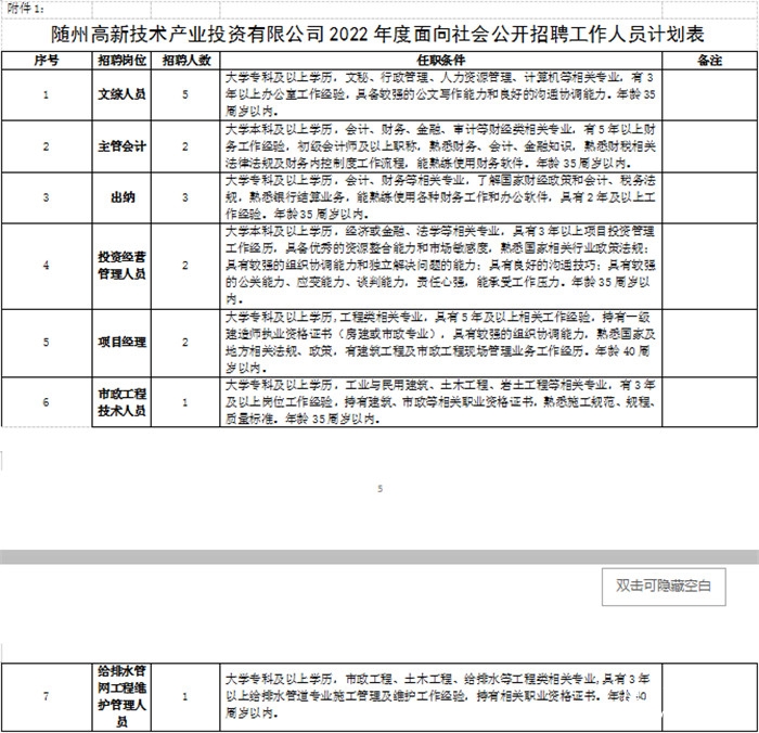 本次招聘面向符合条件的人员,具体岗位、数量及要求见《随州高新技术产业投资有限公司2022年度面向社会公开招聘工作人员计划表》(附件1)。