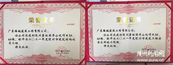 近日,随州市建筑业协会公布2021年随州市工程领域获奖名单,随州碧桂园半山悦项目分别荣获“2021年度随州市建筑结构优质工程”和“2021年度随州市建筑工程安全文明施工现场”两项荣誉。