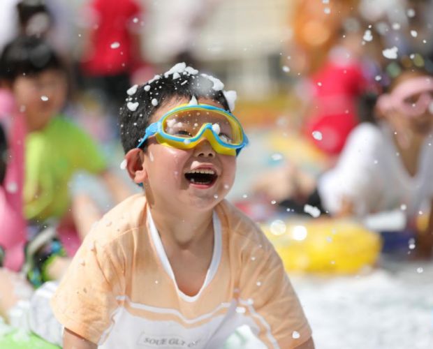 5月30日,在江苏省淮安市洪泽湖幼儿园迎“六一”活动中,小朋友们在参加“泡沫派对”活动。