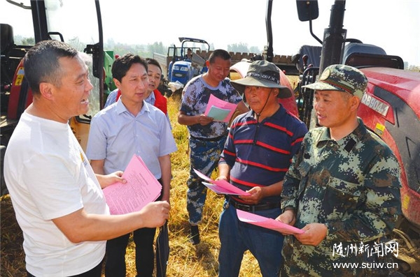 6月6日,正值“三夏”农忙时节,随县农机安全监理站再次组织各镇(场)农机服务中心管理人员,到田边地头农机作业现场,向机手宣讲农机安全生产知识,发放《农机技术指导手册》。图为新街镇兵哥农机专业合作社宣讲、发放现场。 (随州日报通讯员周运动、陈姿含、石守京摄)