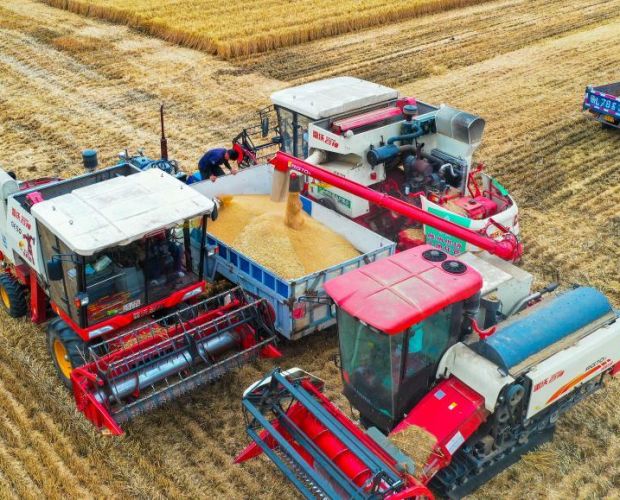6月12日,村民在山东省滕州市级索镇优质小麦良种繁育基地装运刚收割的小麦(无人机照片)。
