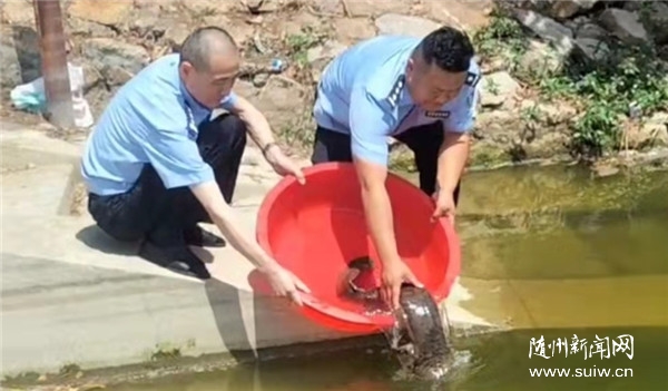 14日上午,随县农业农村局综合执法大队接到热心群众电话,声称有人在随县吴山水库钓到一条“四脚怪”的水生动物。因当时气温高达36度,为防止高温引起动物受伤,须就近现场处置。执法人员立即跟吴山镇派出所联系,公安民警火速赶到现场。经视频辨认,确为一条野生娃娃鱼,现场测量体长84cm,体重4.8公斤,娃娃鱼活性好,游动正常,当即将其放生。