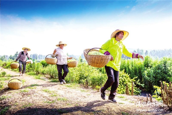随县高城镇新屋村金银花基地迎来丰收季。该基地是随州市启程农业有限公司与新屋村集体合作,采取“公司+村集体+基地+农户”模式,在新屋村流转200亩土地建设的农业综合产业园,亩产值达1.2万元。图为村民在基地务工创收。 (随州日报全媒记者孙洪涛、通讯员张玉国摄)