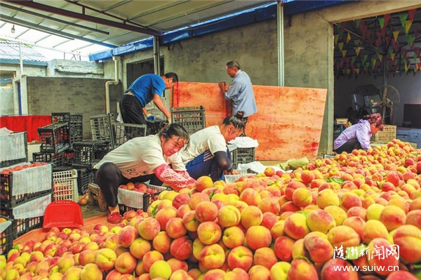 今年春季我市气温较低、气候干爽,水果产量比往年有所减少,但水果品质变得更好,赢得了市场青睐,果农减产反增收。图为6月12日,随县尚市镇太山村毛桃、黄桃收购点繁忙的景象。 (随州日报全媒记者 李文军摄)