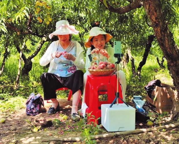 眼下正是桃子大量上市的季节。市商务局积极牵线搭桥,为全市种桃规模较大的村引入优质电商销售团队,以直播带货助力种植户将桃子卖出好价格。图为直播达人在随县尚市镇南岗村桃园直播带货。
