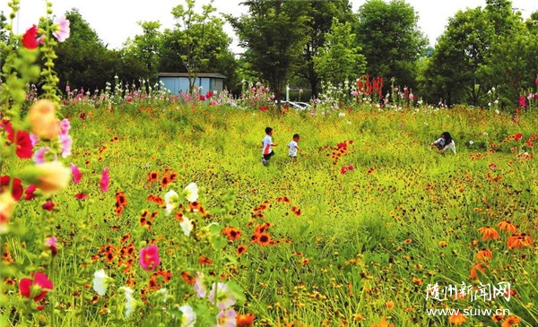 仲夏时节,位于随城东北方位的花溪湿地公园迎来盛花季,蜀葵和非洲菊等时令鲜花竞相绽放,绚丽多姿,吸引市民纷纷前来游览观赏。(随州日报通讯员 聂少峰摄)