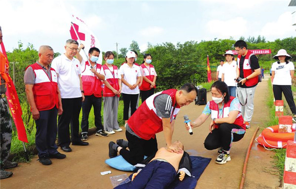 6月28日,广水市红十字会到武胜关镇组织开展未成年人防溺水应急救护演练。演练模拟有人不慎落水,救援人员迅速将其救起并转移到安全地带,红十字会志愿者对其实施心肺复苏术,将其救活。 (随州日报通讯员刘小斌、蔡源摄)