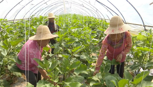 近日,在随县安居镇姜家棚村蔬菜基地,不少村民正在大棚里采摘茄子,炎热的天气挡不住他们丰收的喜悦。