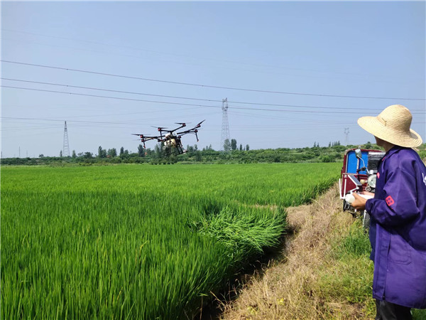 8月3日,尚市镇尚市店社区4组,在村民王敏远家的水稻田边,镇人大代表方华跟无人机操作师傅叮嘱着。交待清楚后,肥料加满,无人机飞向稻田上空,开始施肥作业。