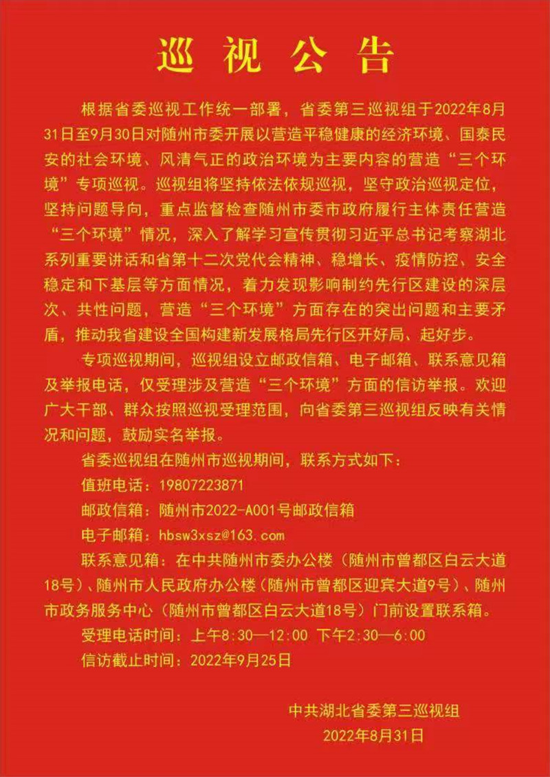 根据省委巡视工作统一部署,省委第三巡视组于2022年8月31日至9月30日对随州市委开展以营造平稳健康的经济环境、国泰民安的社会环境、风清气正的政治环境为主要内容的营造“三个环境”专项巡视。巡视组将坚持依法依规巡视,坚守政治巡视定位,坚持问题导向,重点监督检查随州市委市政府履行主体责任营造“三个环境”情况,深入了解学习宣传贯彻习近平总书记考察湖北系列重要讲话和省第十二次党代会精神、稳增长、疫情防控、安全稳定和下基层等方面情况,着力发现影响制约先行区建设的深层次、共性问题,营造“三个环境”方面存在的突出问题和主要矛盾,推动我省建设全国构建新发展格局先行区开好局、起好步。