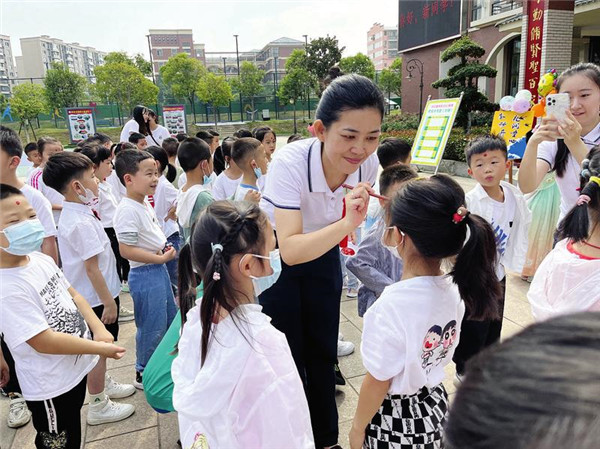 新学期伊始,曾都区白云湖学校举行“开蒙礼”,校长和老师们为小学一年级新生点亮朱砂、开启智慧。 (随州日报全媒记者 李文军摄)