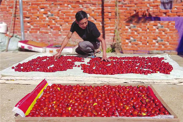 “红玉”压枝满湾香。随县唐县镇华宝山村是著名的枣乡,更是金黄蜜枣的原产地。该村现存5000余棵枣树,其中挂牌保护、百年以上的古枣树有490余棵。中秋时节,红枣挂满枝头,枣香扑鼻。图为华宝山村村民正在打枣、晒制红枣。 (随州日报全媒记者李文军摄)