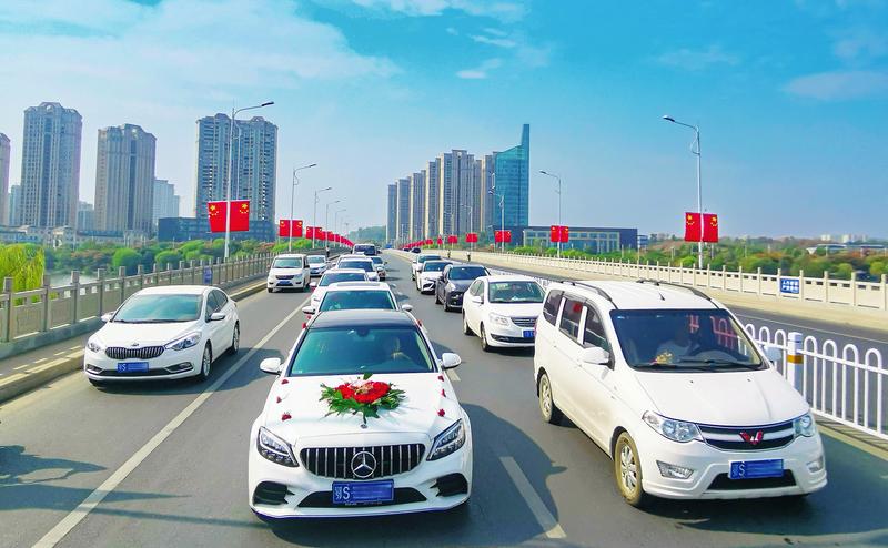 国庆长假喜事多。许多喜结连理的新人将婚礼举办的吉日良辰安排在“十一”国庆长假期间。图为10月1日,一支迎亲车队正在通过编钟大桥。