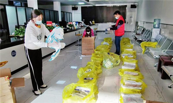 10月19日,志愿者在曾都区涢水街道风光社区为小区15个核酸检测点分配试剂、防护服、消毒剂等核酸检测物资。 (随州日报全媒记者李文军摄)