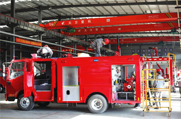今年前三季度,中车楚胜产销两旺,产值和销售额与去年同期相比都有增长。图为10月19日,中车楚胜的工人们正在赶制消防车订单。(随州日报全媒记者徐斌摄)