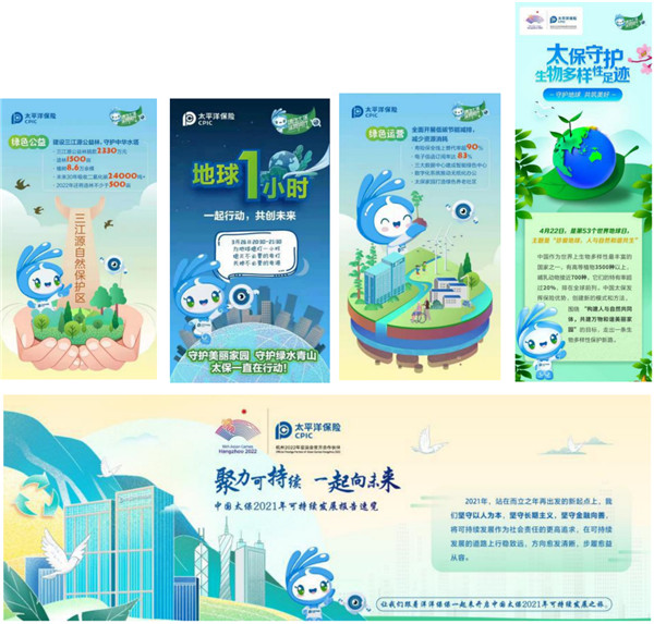 2021年,中国太保推出“绿动太保,你我同行”绿色品牌,设计视觉识别系统,并整合实施视觉统一、内容体系化的绿色传播。同时对太保实施的绿色保险、绿色投资等进行重点传播。2021年围绕“零碳进博”传播碳中和综合解决方案,2022年进一步传播“零碳进博、零塑办博”理念。做好中国太保独创的野生动物肇事公众责任保险传播,确立保护生物多样性的保险标杆。针对气候变化引发的暴雨、台风等灾害,太保推出巨灾保险报道,形成应对气候变化的“太保样本”。在绿色运营方面,推出了太保家园建设绿色家园,打造绿色健康养老服务体系等系列报道。在绿色公益方面,通过记者探访、客户活动等多种方式传播,展示太保三江源公益林作为生态之林、经济之林和民族之林给当地环境带来的变化。围绕植树节、环境日、地球日、生物多样性日等重要时间节点,策划上线太保森林小程序、绿色行动宣言、守护生物多样性足迹等传播,吸引各利益相关方参与,共建美好家园。持续倡导绿色理念。发布可持续发展报告,全面展示太保在ESG等方面的成效。公司高管参与监管机构、行业、媒体和评级机构等组织的绿色交流活动,分享太保在绿色保险、投资和运营等方面的成效与经验;面向广大客户,倡导无纸化,推行电子信函、电子保单、电子保全等低碳使用;面向员工,推出碳足迹平台,从减少能源消耗、实行绿色办公等方面减少碳排放。