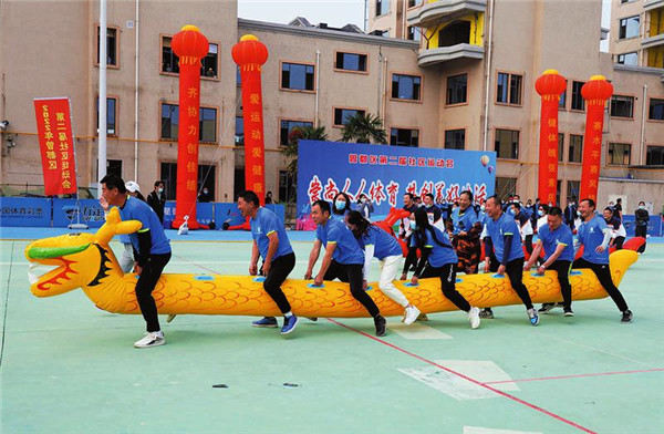 11月5日至9日,曾都区第二届社区运动会在齐星健身村举行,来自全区16个社区550余人参加乒乓球、羽毛球、跳绳、旱地龙舟等10余个项目的角逐。图为旱地龙舟项目比赛现场。 (随州日报全媒记者 李文军摄)