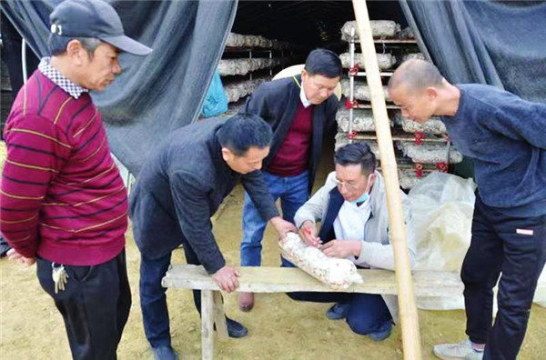 市食用菌协会组织专家发挥技术优势,开展技术培训,进村入棚指导菇农开展养菌管理。图为食用菌专家日前深入广水市郝店镇关店村顺胜合作社菇棚,为病袋进行“手术”,现场“开药方”。(随州日报通讯员 石守京摄)