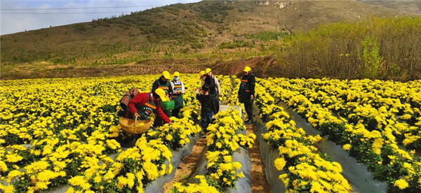11月下旬,随县殷店镇雄峰村菊花基地的金丝皇菊全面进入盛开期。目前正在采摘第二茬,已采收7.5万公斤。今年鲜菊花每公斤售价14元至20元,干菊花每公斤120元至260元,预计基地毛收入可超200万元。(随州日报全媒记者记者 常跃耀摄)