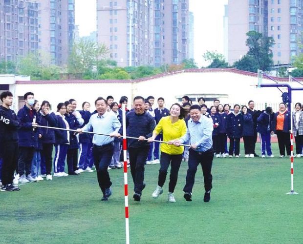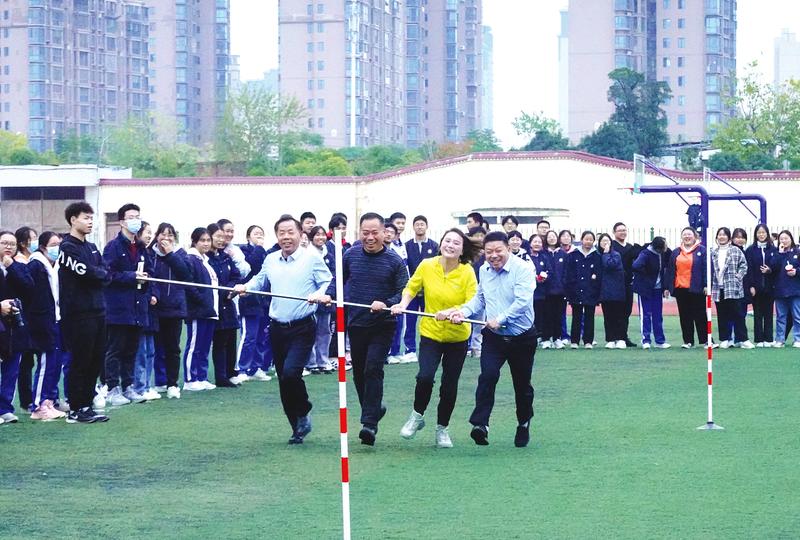 为丰富学校教职工的文化生活,增强团队凝聚力,激发教职工拼搏创新的精神,随州一中近日举行2022年冬季教职工运动会。图为高二年级教师组正在进行“无敌风火轮”比赛的精彩瞬间。(随州日报全媒记者李文军摄)