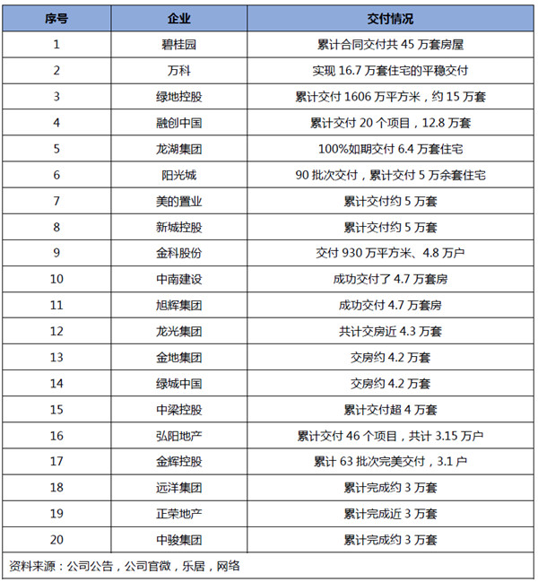 据乐居财经研究院统计,2022年前三季度,已公示交付套数的35家房企累计交付房屋总数约147万套,涉及1300多个楼盘。其中,碧桂园、万科、绿地、融创、龙湖位居前五,分别交付45万套、16.7万套、15万套、12.8万套、6.4万套,合计交付数量95.9万套,占交付总量的65%以上。