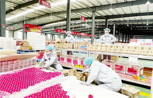 品源(随州)现代农业发展有限公司坚持走精深加工之路,不断推动产品迭代,抓住消费者味蕾。香菇辣酱系列产品自去年底上市以来,受到消费者的喜爱,在抖音等电商平台供不应求,目前已累计销售突破1亿罐。图为该公司打包车间内,工人们正在马不停蹄打包装箱,每天有近2万个订单从这里发出。 (随州日报全媒记者张琴、见习记者钟金辉摄)
