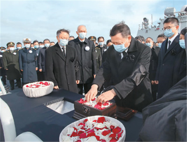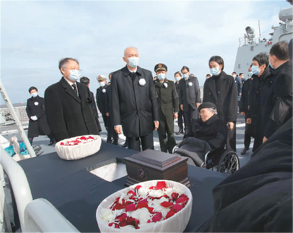 中午12时35分,扬州舰抵达长江入海口水域。在军舰甲板上,送别的人们,肃立默哀。水天肃穆,波翻浪涌。蔡奇和江泽民同志的夫人王冶坪等亲属,眼含热泪,强忍悲痛,将江泽民同志的骨灰和缤纷的花瓣一起缓缓撒向无垠的江海。