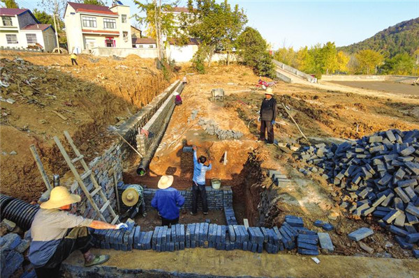 曾都区洛阳镇九口堰村以办好群众身边事,提升幸福感为目标,探索美好环境与幸福生活共同缔造路径。图为该村2组村民正在自己动手兴建当家堰污水处理池。 (随州日报全媒记者 李文军摄)