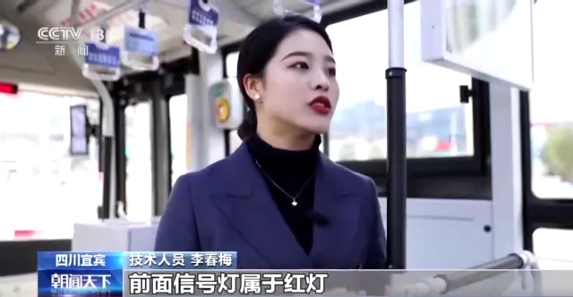 技术人员 李春梅:左下角是显示车辆的驾驶状态,目前是属于自动驾驶模式,上面也有站点以及时速的显示。目前车辆检测到前面信号灯属于红灯,它也会自动进行停或者是启动的判别。
