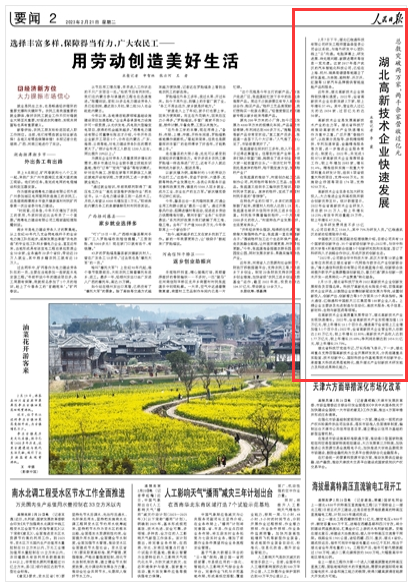 今天(2月21日),《人民日报》发表文章《总数突破两万家,两千余家营收过亿元——湖北高新技术企业快速发展》,全文如下: