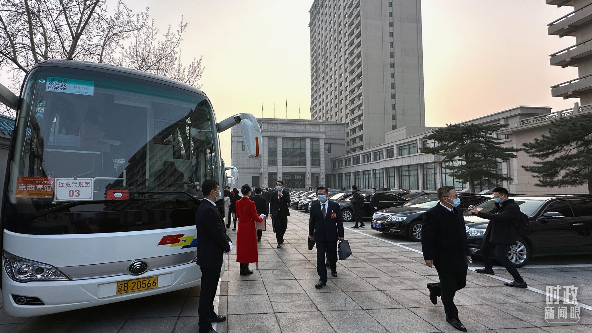 △2023年3月5日,江苏代表团乘车前往人民大会堂。(江苏省广播电视总台记者 周明、张正拍摄)