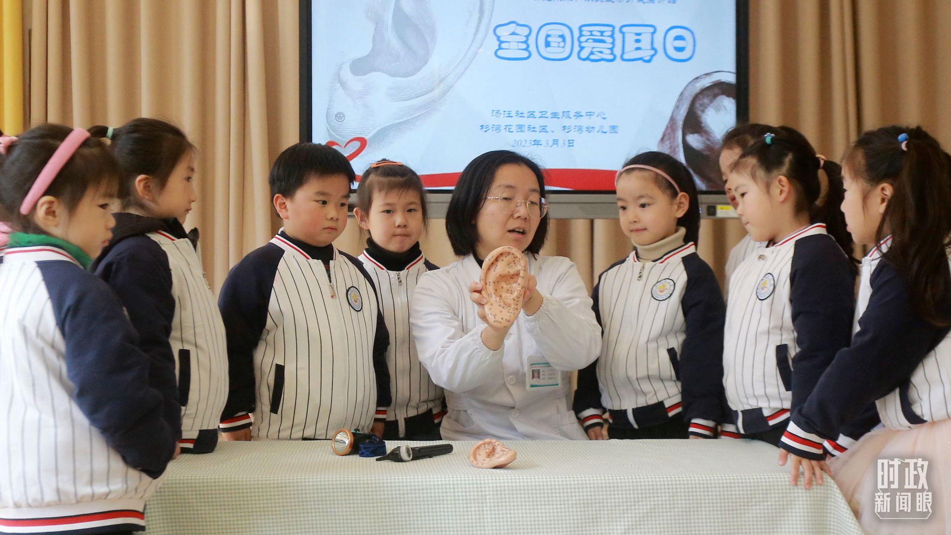 △2023年3月3日,全国爱耳日当天,江苏扬州一位社区医生正在为小朋友们讲解护耳知识。(图/视觉中国)