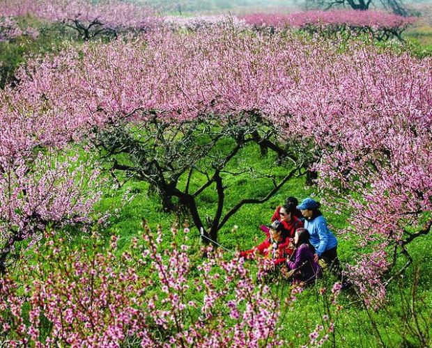 65岁的游客刘强说:“我是从武汉来的,在这里不仅可以爬山锻炼身体,还可以欣赏漫山遍野的桃花,美极了。”