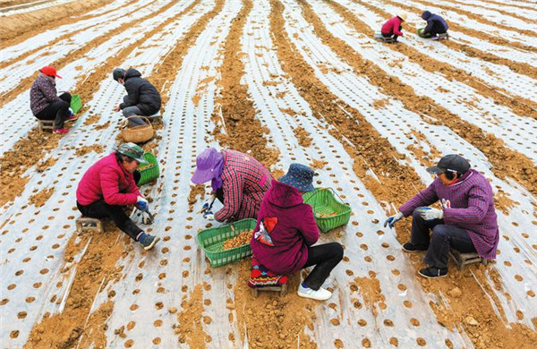 随县高城镇着力打造特色农业种植示范区,在全镇发展中药材种植。今年该镇计划发展各类中药材种植面积4000亩,力争3年后种植面积达到1万亩以上。图为大桥村村民在抢种地黄。 (随州日报通讯员 张玉国摄)