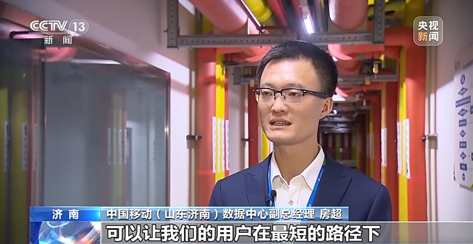 中国移动(山东济南)数据中心副总经理 房超:通过这种本地化的部署,可以让我们的用户在最短的路径下访问后台服务器,从而享受到最快的网速、最低的时延。另外在国家“东数西算”的战略中,也能够起到海量数据调度和处理的作用。