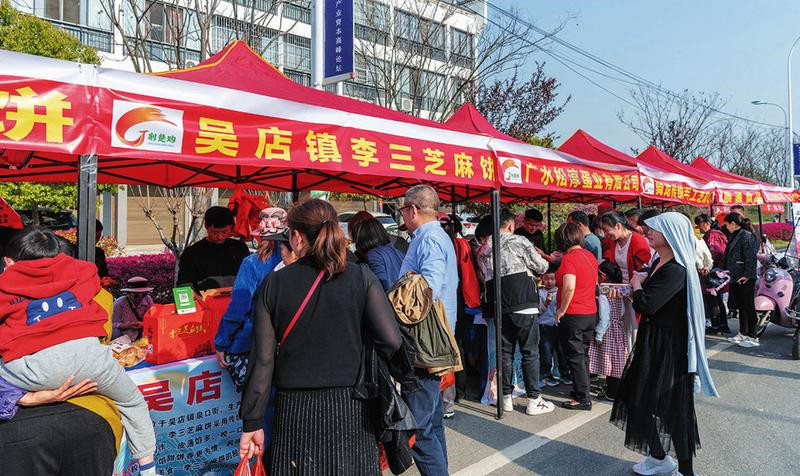4月1日,“大地欢歌四季村晚”——中华山盟·月光海誓汇聚广水消费年暨月光海招商推介会在长岭镇举行,全面启动该市“四季村晚”、广场舞展演、“乡村四时好风光”乡村旅游精品线路推广等12项乡村文化系列活动,并组织“送戏下乡”、送图书、非遗下乡等文化惠民活动,以文惠民、以文塑旅、以旅兴业,丰富、活跃农民群众文化生活,推动乡村文化和旅游深度融合发展。图为文旅产品大集上,爱好美食的群众争相购买农产品。 (随州日报通讯员 喻光沛摄)
