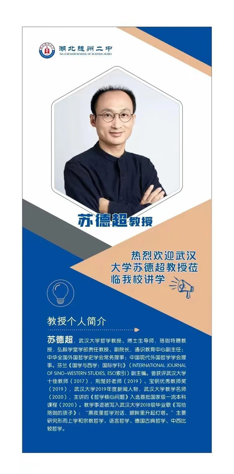 苏德超先生,武汉大学哲学教授、博士生导师,珞珈特聘教授,弘毅学堂学部责任教授、副院长,通识教育中心副主任,中华全国外国哲学史学会常务理事,中国现代外国哲学学会理事。芬兰《国学与西学:国际学刊》副主编。曾获评武汉大学十佳教师(2017),荆楚好老师(2019)、宝钢优秀教师奖(2019),武汉大学2019年度新闻人物,武汉大学教学名师(2020),主讲的《哲学核心问题》入选首批国家级一流本科课程(2020)。教学事迹被写入武汉大学2018级毕业歌《写给珞珈的孩子》:“黑夜里哲学对话,眼眸里升起灯塔。”主要研究形而上学和宗教哲学、语言哲学、德国古典哲学、中西比较哲学。