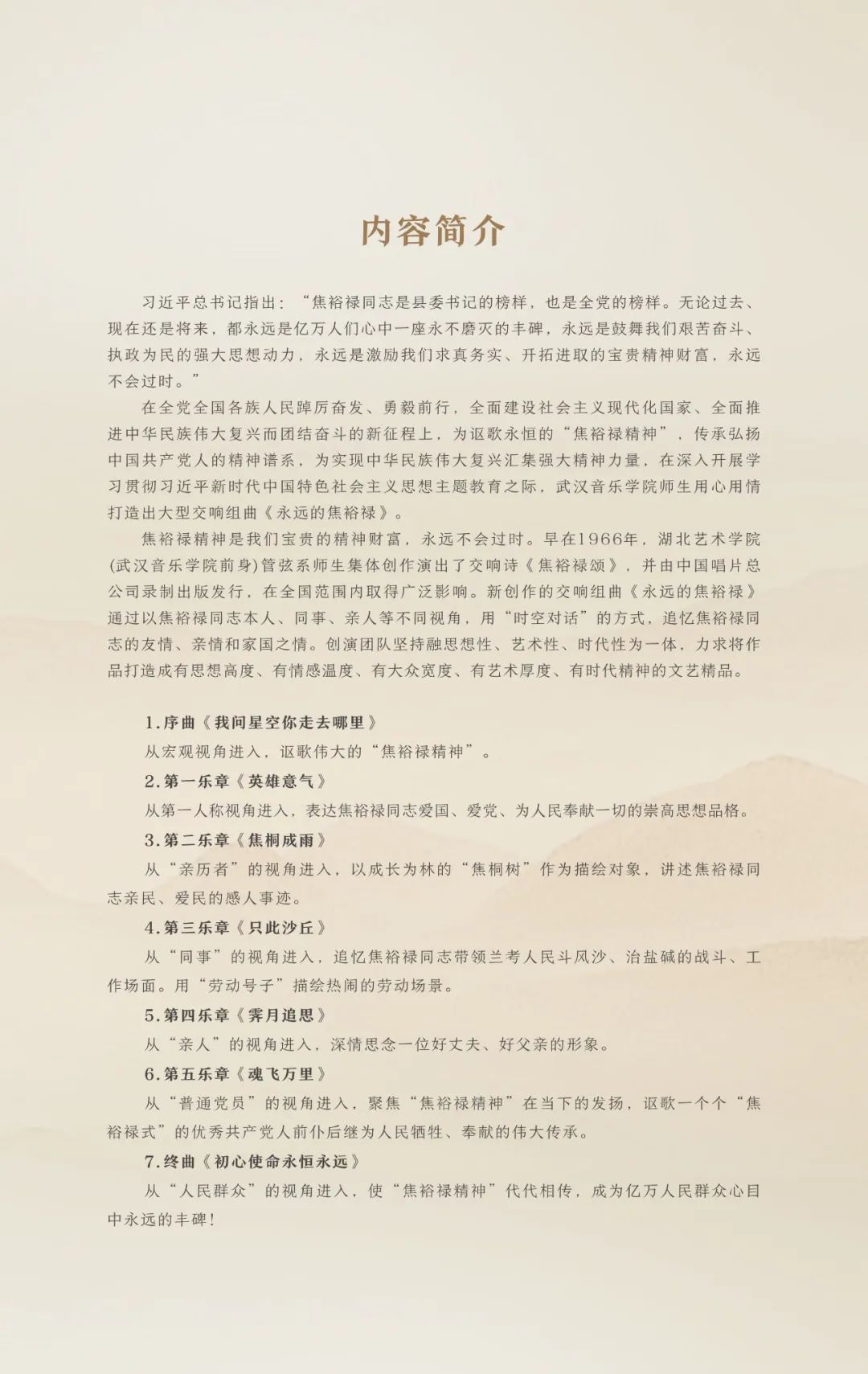 在全党全国各族人民踔厉奋发、勇毅前行,全面建设社会主义现代化国家、全面推进中华民族伟大复兴而团结奋斗的新征程上,为讴歌永恒的“焦裕禄精神”,传承弘扬中国共产党人的精神谱系,为实现中华民族伟大复兴汇集强大精神力量,在深入开展学习贯彻习近平新时代中国特色社会主义思想主题教育之际,武汉音乐学院师生用心用情打造出大型交响组曲《永远的焦裕禄》。