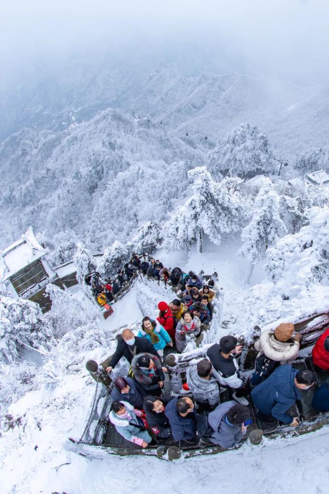 武当山的雪天,排队登顶的游人。摄影/罗斌