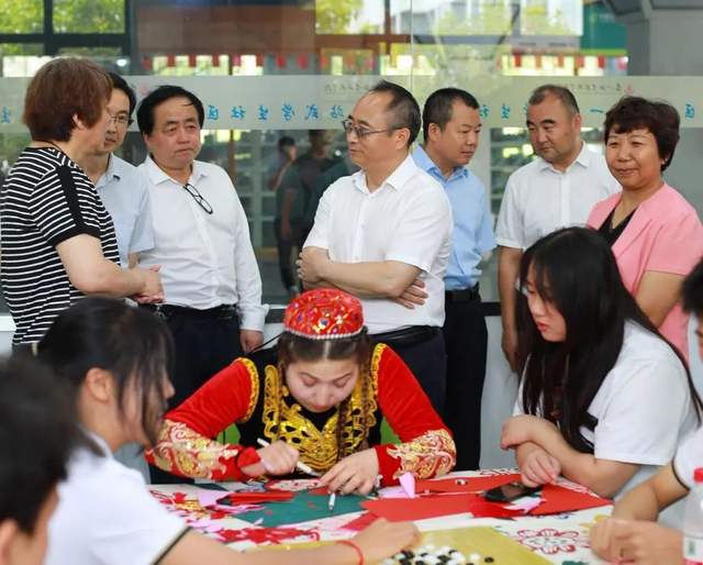 启动仪式结束后,赵军章一行还深入我校实地调研,他先后来到土木与建筑工程学院教室、服装与艺术设计学院学生作品室、同心石榴园(铸牢中华民族共同体意识文化长廊)、和谐号实训基地、红石榴之家活动中心等处。赵军章认为我校民族团结进步工作政治站位高,平台载体新,活动开展实,紧紧围绕铸牢中华民族共同体意识为主线,有感有效有力推进了各民族师生交往交流交融。调研中,他还与新疆内派辅导员卢爱敏等各民族师生进行亲切交谈。