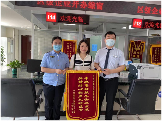 随州新闻网讯 (通讯员喻婕 陈会)“非常感谢你们热情、贴心的服务。”6月15日,湖北糖涩餐饮管理有限公司的朱女士将一面印有“专业高效服务企业发展 热情贴心彰显文明监管”字样的锦旗,送到曾都区市场监管局驻行政服务大厅窗口工作人员手中。