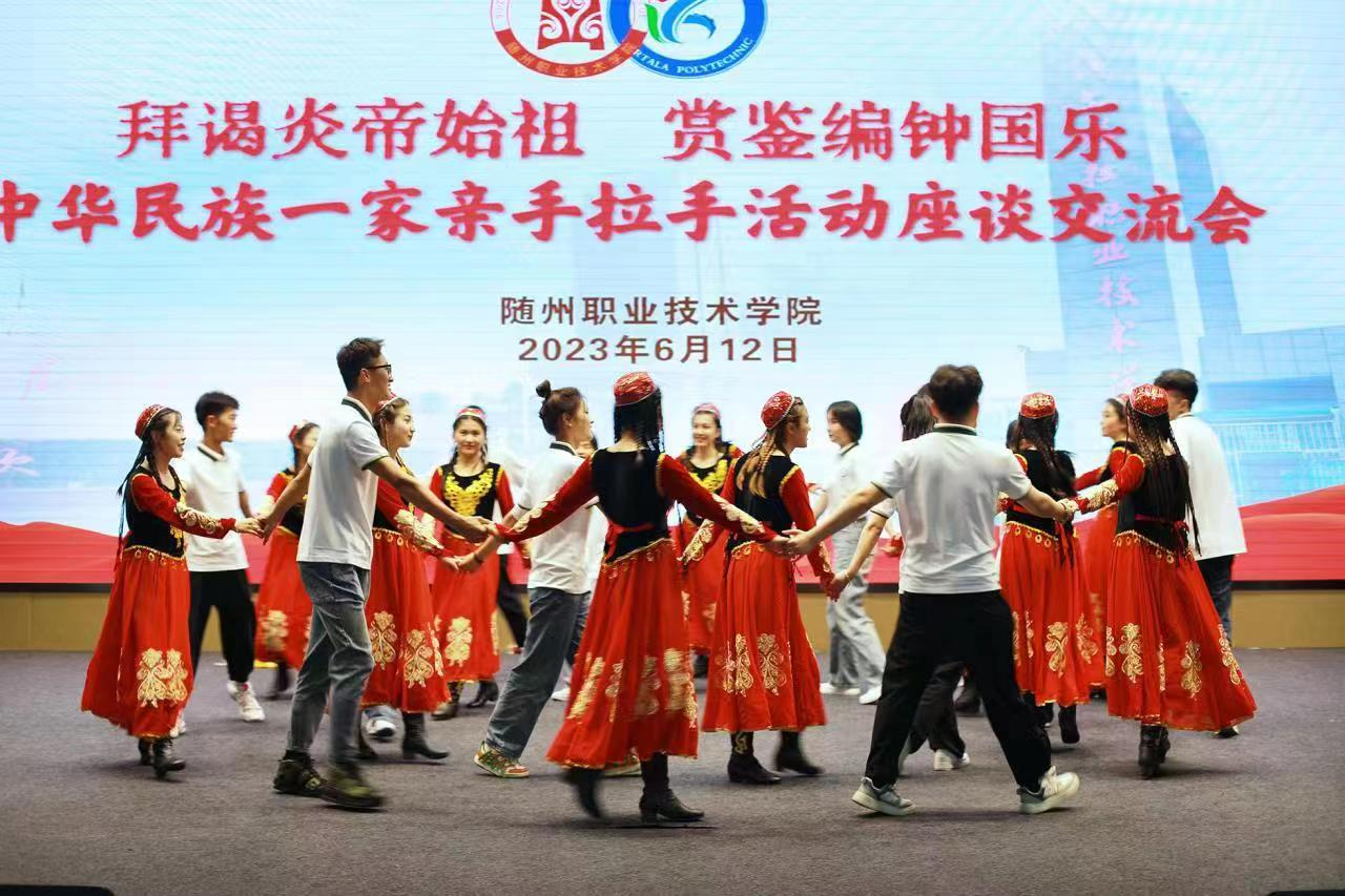 两地师生都身着五彩斑斓的民族服饰,载歌载舞,以自己民族特有的方式展示最炫“民族风”,将现场气氛一次次推向高潮。“编钟敲起来,激情更澎湃……”,随州职院学生首先以歌伴舞《编钟敲起来》,向客人们展示了随州曾侯乙编钟礼乐文化之魅力;一首《随州美》,礼赞了新时代随州高质量发展的态势,向客人们发出盛情邀请;博州职业技术学院15名师生们也精彩亮相,献上了极具民族特色的歌伴舞《敕勒歌》、《美丽的姑娘》,抒发了少数民族人民对美好生活的向往,展示了迷人的民族风情;集体诗朗诵《年轻的城》,则澎湃着奋斗的热血、洋溢着青春的激情。文艺表演好戏连台、精彩不断,在随州职院学生的大合唱《万疆》中落下帷幕。两地师生用文化和艺术的魅力沟通民族感情,共绘出了民族团结的生动画卷。