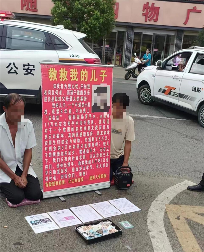 民警赶到现场,发现两名中年男子跪在路边乞讨。其中一名男子声称,自己的儿子身患尿毒症,需要巨额治疗费用,但家中贫寒,希望路人伸出援助之手,旁边还放着儿子的病历、展示病情的广告牌以及收款用的微信二维码,身边的音响播放着悲情音乐。一时间,吸引不少路人驻足围观,好心群众纷纷捐款。当民警询问二人是否需要帮助时,两人异口同声道“不需要”,此行为引起民警警觉。在民警进一步询问时,两男子闪烁其词,欲整理东西离开。民警初步判断,这名男子很可能是以治病为幌子进行诈骗,遂将二人带回派出所进一步调查。