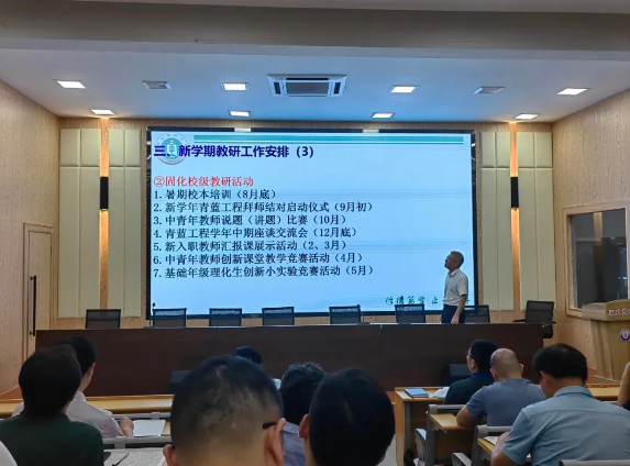 教师发展中心主任任志刚总结上学期教学研修工作,一是第二课堂活动开展积极,做到了组组有活动,科科各不同,但有待丰富提升。二是观摩课活动基本全员参加,但程序还有待完善。三是青蓝工程师徒听课活动有序开展,但导师的配备和安排仍需优化。四是集体备课活动能够一周一研修,但尚待进一步规范,且应向精细化转变。五是学科组的教研活动坚持了一月一例会,但缺乏主题培训活动。六是逐步健全了学校层面的培训活动体系,但尚待进一步优化。结合其他学校的第二课堂活动,为组长们展示了丰富的活动项目,并提出第二课堂活动的要求。对新学期教研工作安排,从暑期培训、校级教研活动、集体备课活动、青蓝工程、观摩课等方面提出了严格的要求和计划。