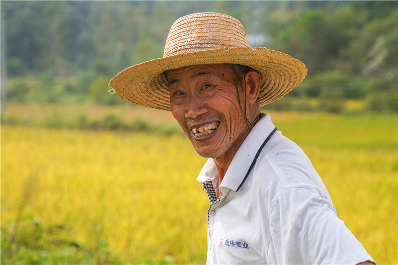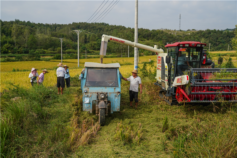 9月7日,曾都区洛阳镇君子山村机声隆隆,村民们开始收割成熟的水稻。村民们介绍,今年收成非常不错,非常开心。(全媒记者 孙洪涛摄)