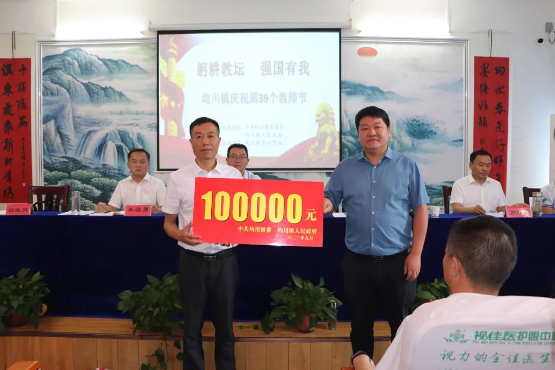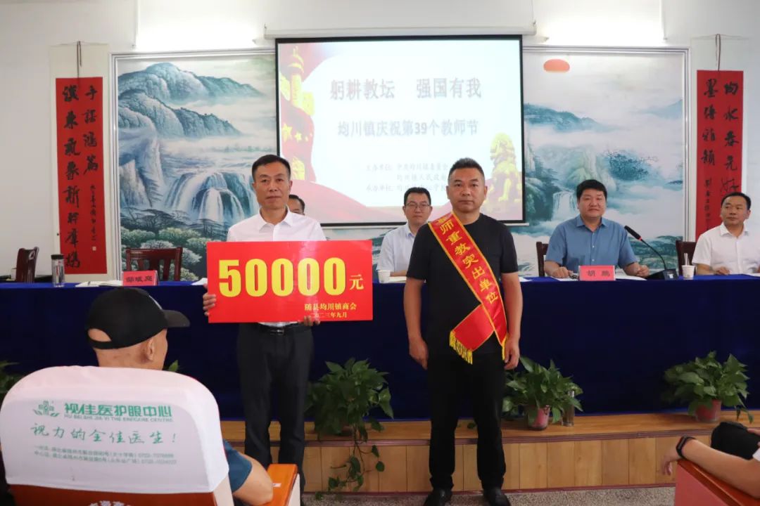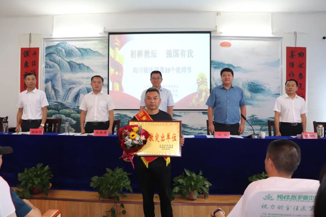 镇党委宣传委员、武装部长朱国勇宣读市县镇表彰文件,与会领导为受表彰教师颁发证书和奖金,学生代表向辛勤的园丁献上鲜花和节日祝福。均川商会现场向中心学校捐赠教育经费50000元,均川镇党委政府向教育总支颁发教学质量奖金100000元。优秀教师王筱寻、师德标兵毕方、优秀班主任罗云华、优秀教育工作者张俊分别作典型发言。会议还向均川商会颁发了“尊师重教突出单位”奖牌。